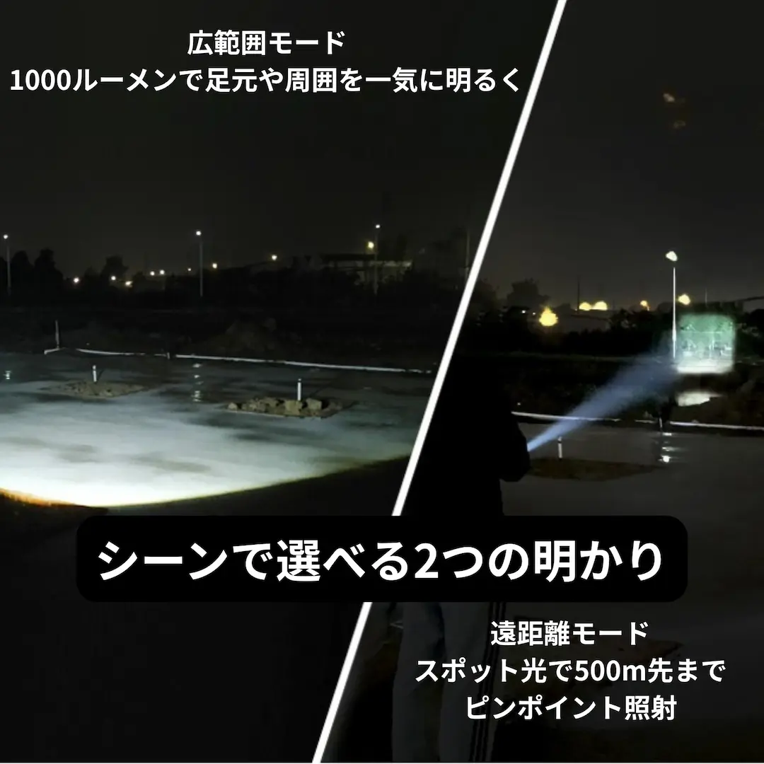 足元を広く照らしたい時も、遠くまでしっかり照らしたい時も。